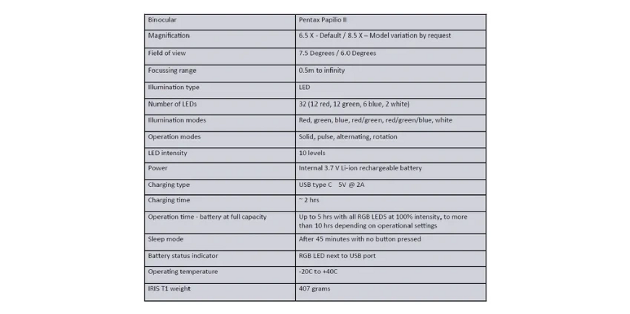 angle white LED lights. The IRIS T1 offers 14 modes of operation, single and multiple RGB LED light combinations, 4 search settings, variable LED light intensity, quality optics, long battery life, intuitive easy to use ergonomic controls, and a smartphone adapter for photo/video documentation and optional target view